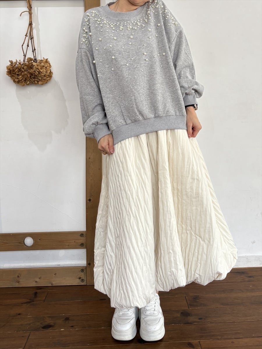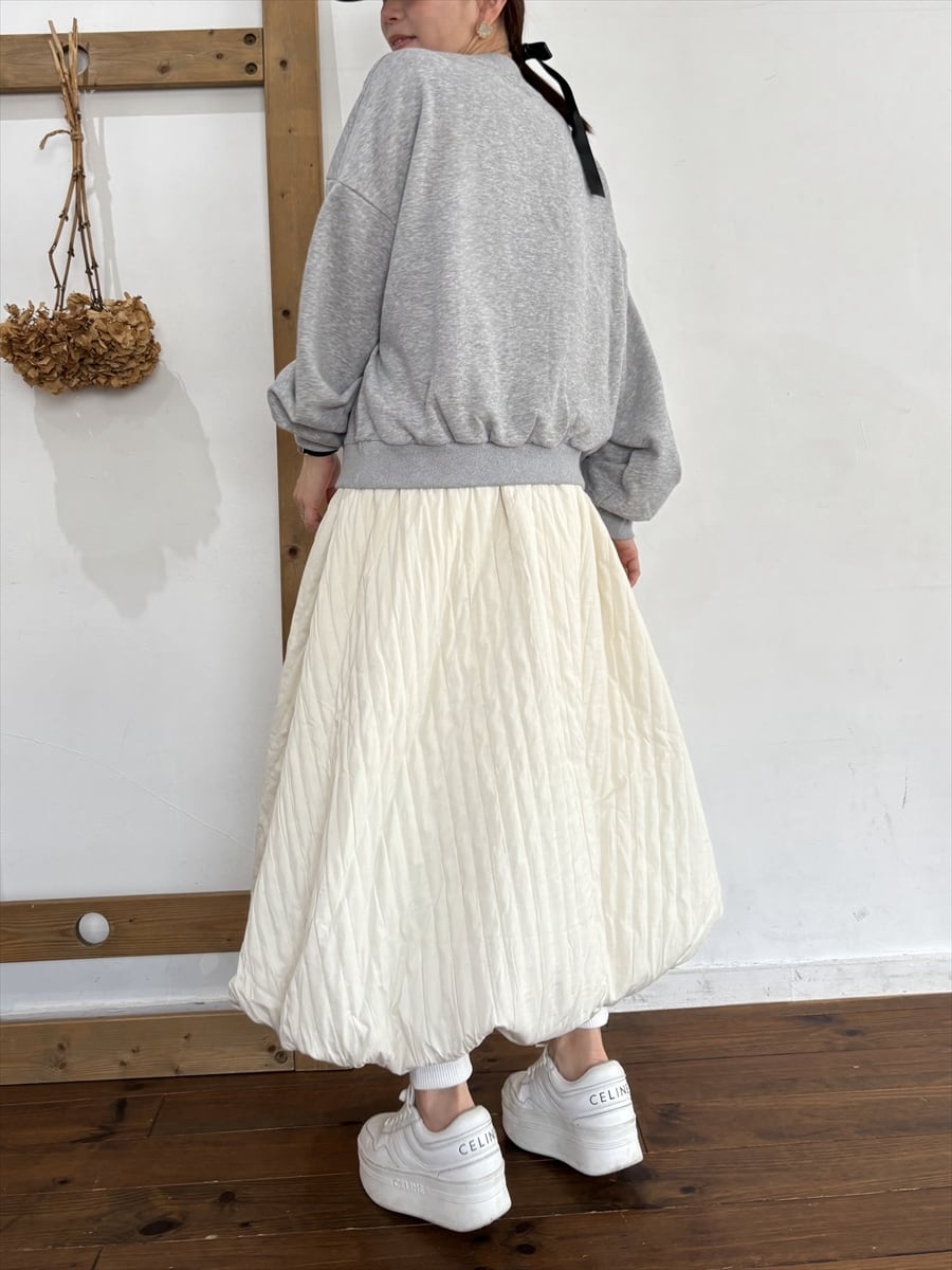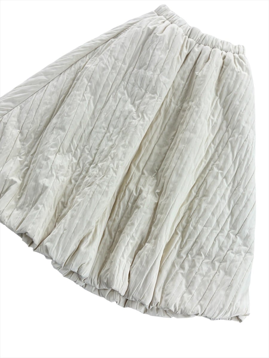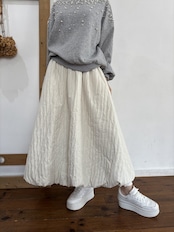 ボリュームたっぷりで立体的なシルエットが可愛いキルティングパンプキンスカート。 縦ラインのキルティング素材なので、プリーツスカートやギャザースカートのように取り入れていただきやすい1枚です。 柔らかなオフホワイトカラーは、春先にも活躍してくれます。 ウエスト部分は総ゴム仕様、両サイドポケット付きのデザインです。