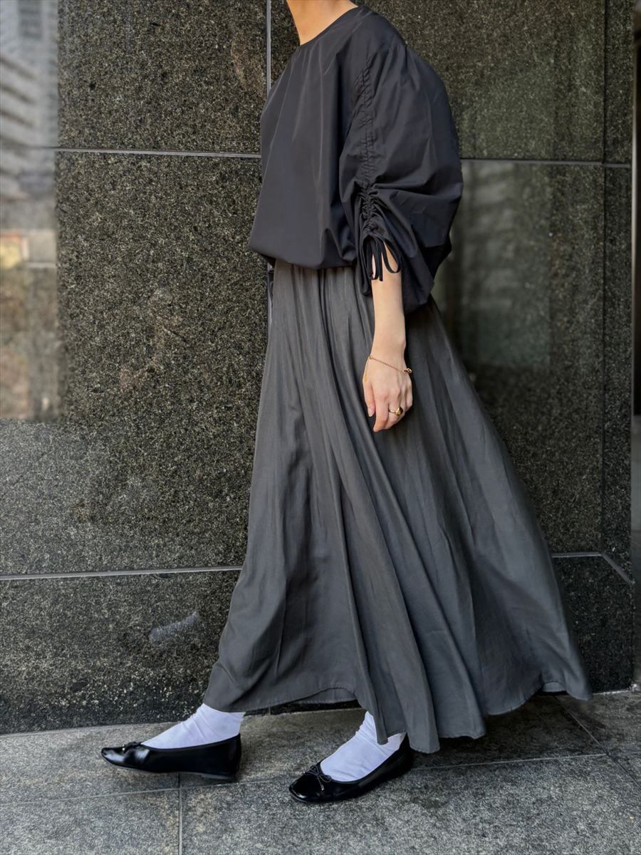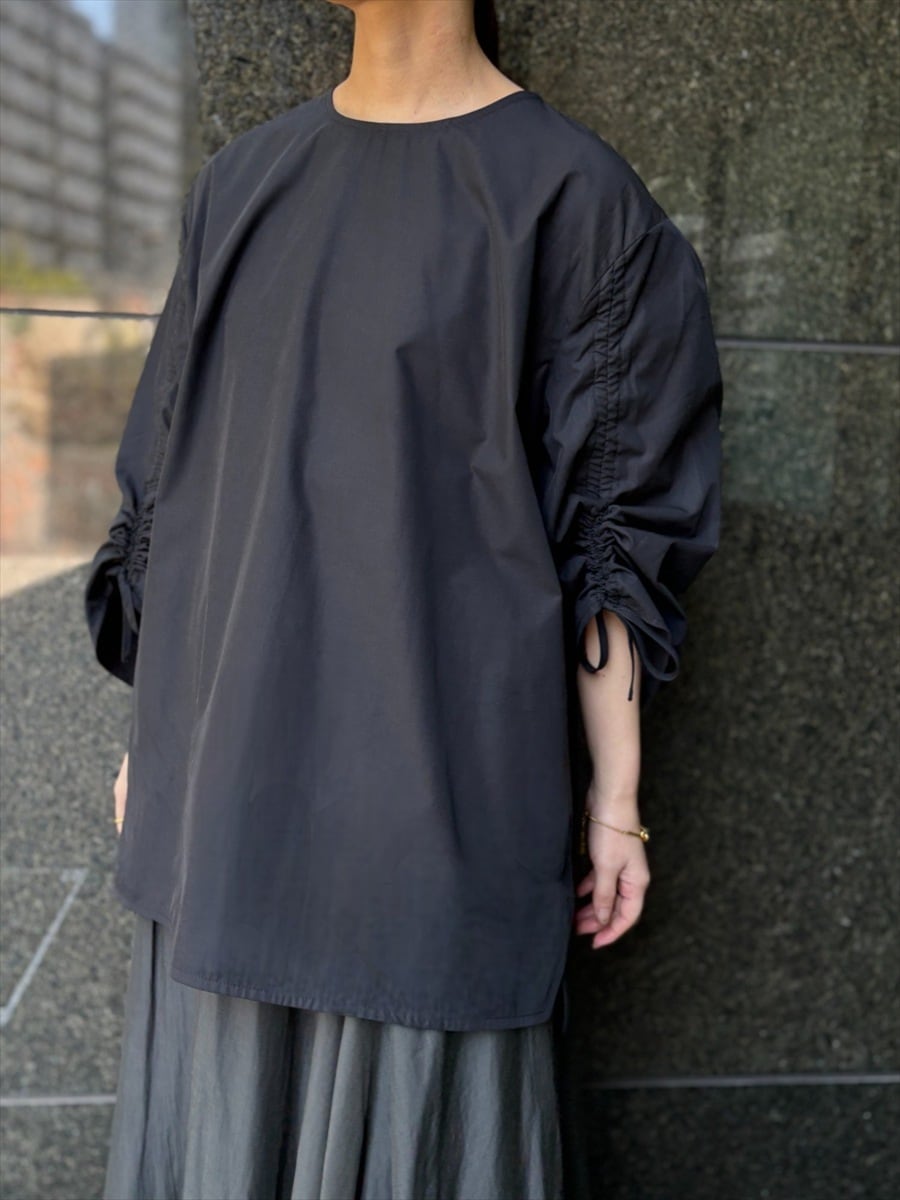 サイドのシャーリングで袖のボリュームと長さの調整可能なデザインブラウス。 袖に立体感が出るデザインと、着丈はお尻にかかる長さです。 背中部分の首元箇所にジップ付きなので、着脱もしていただきやすいアイテムです。 ややしっかりとした素材感で、カジュアルからきれいめコーデまで活躍してくれます◎